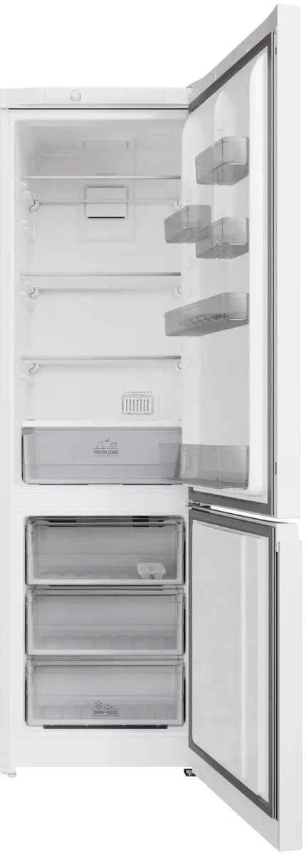 В верхней части холодильной камеры расположены прочные стеклянные полки, которые можно легко переставить по высоте для удобства хранения различных продуктов. На дверце холодильника имеются полки для бутылок и банок, а также карманы для хранения яиц и мелких предметов.