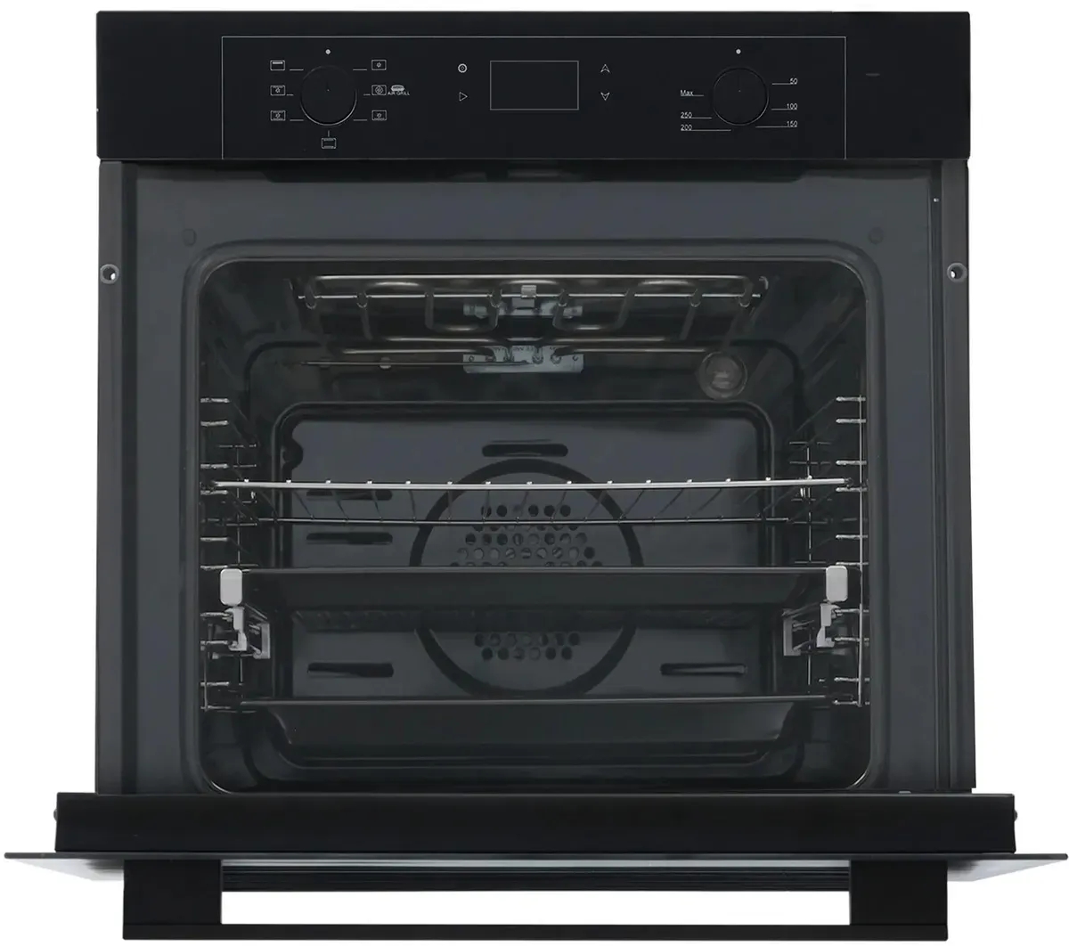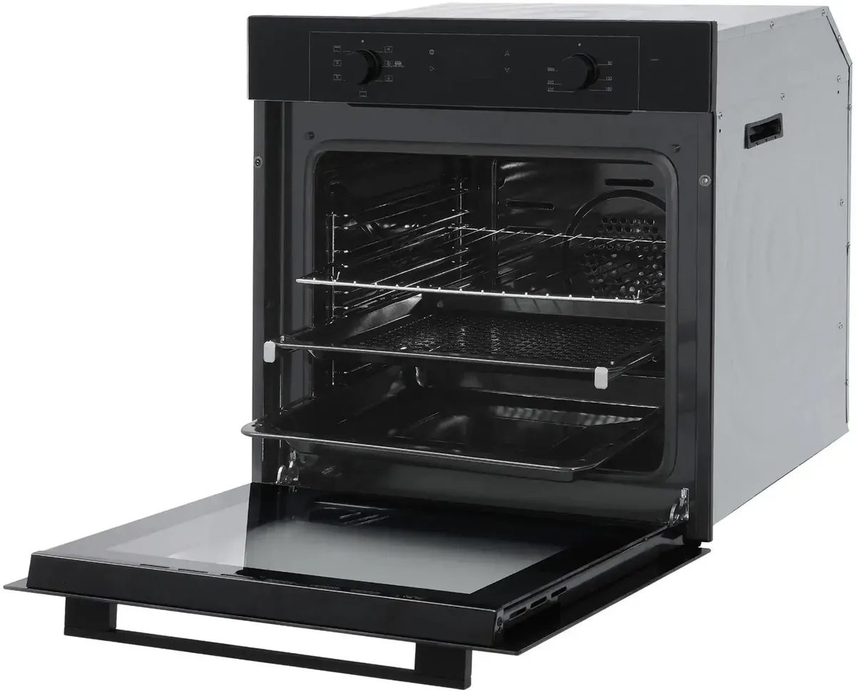 Стильный чёрный дизайн этого электрического духового шкафа станет прекрасным дополнением к любому интерьеру кухни. Он не только функционален, но и эстетически привлекателен.