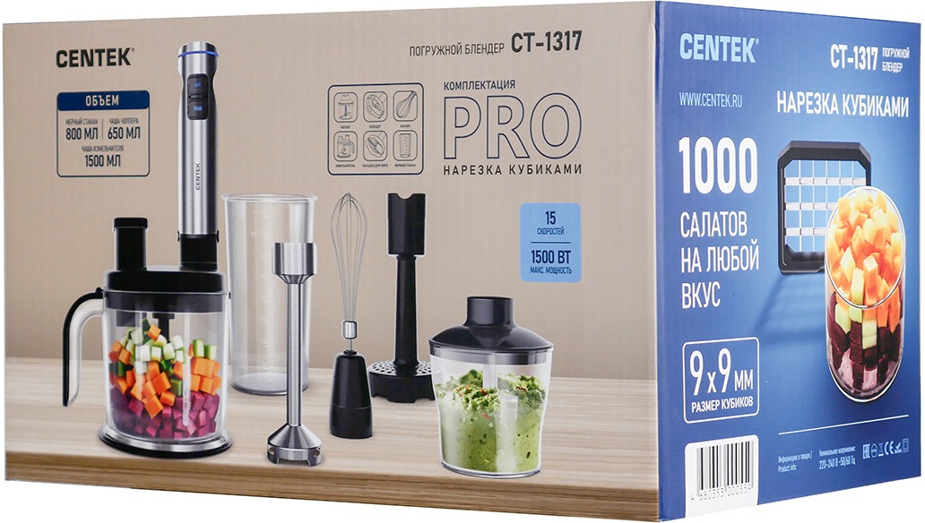 Блендерный набор CENTEK CT-1317 — это мощный и универсальный помощник на кухне. Он оснащён мотором мощностью 1500 Вт, который позволяет быстро и эффективно измельчать продукты любой твёрдости. С помощью этого набора вы сможете легко приготовить смузи, пюре, соусы, коктейли и многое другое.