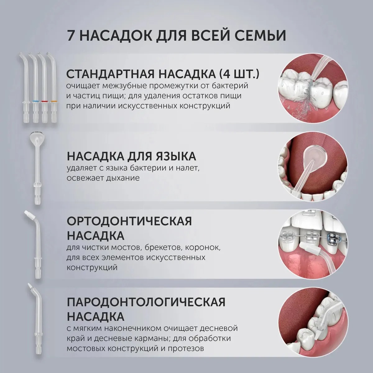 В комплекте с ирригатором поставляются 7 насадок, включая 4 стандартные, 1 ортодонтическую, 1 пародонтологическую и 1 для языка. Это позволяет каждому члену семьи выбрать наиболее подходящую насадку для своих нужд.