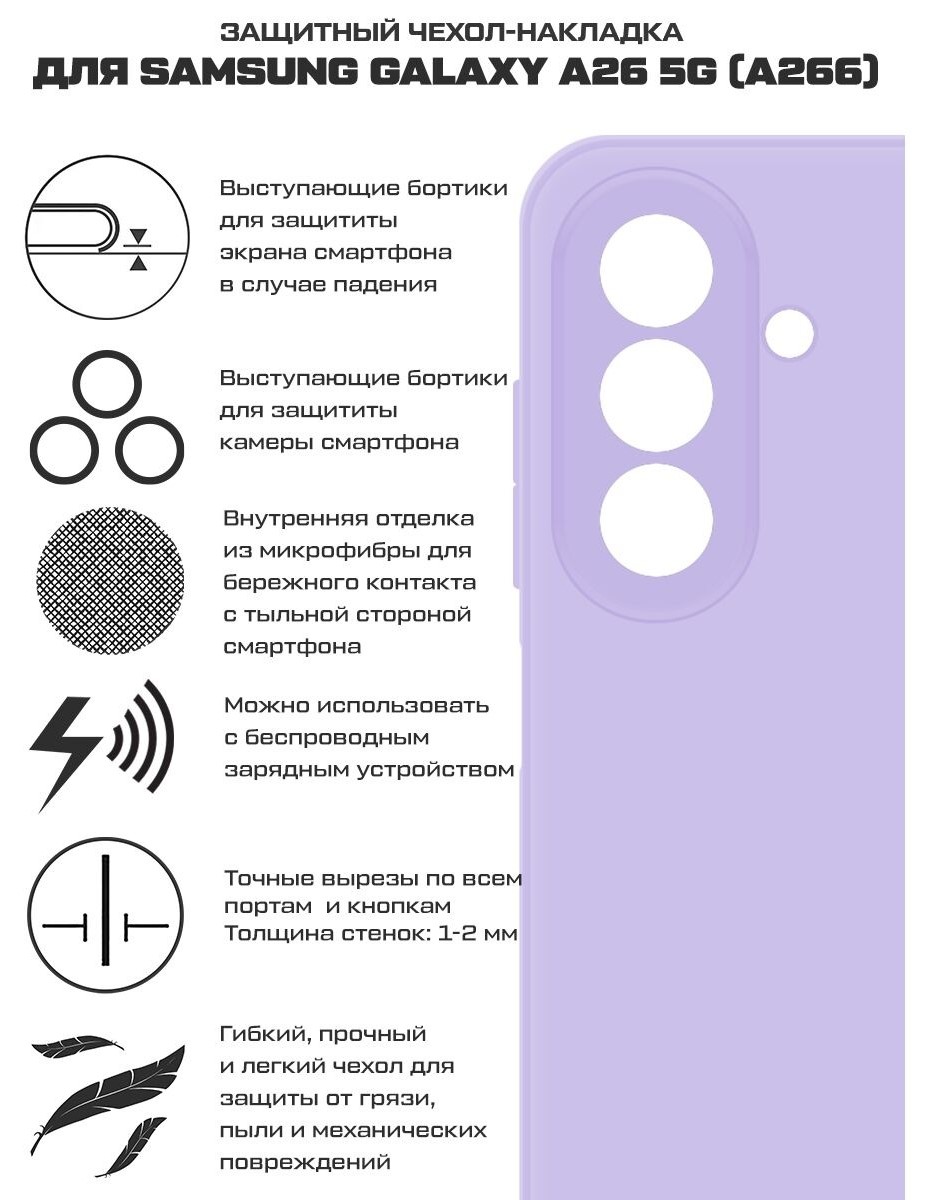 Чехол-накладка Krutoff Silicone Case для Samsung Galaxy A26 в нежном лавандовом цвете — это сочетание стиля и надёжной защиты вашего смартфона. Этот чехол станет настоящим украшением для вашего Samsung Galaxy A26, добавив ему изысканности и индивидуальности.