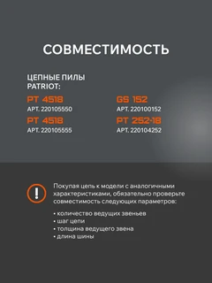Цепь Patriot 73DP-72E — незаменимый аксессуар для тех, кто ценит качество и надёжность в работе с бензопилами. Эта цепь разработана специально для моделей Patriot PT 4518, Patriot PT 252-18 и Patriot GS 152, что гарантирует идеальную совместимость и высокую производительность.