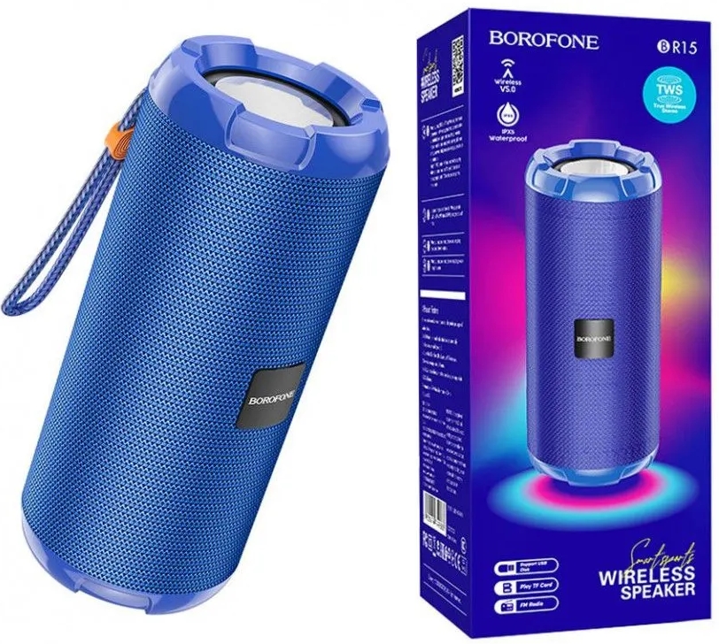 С Borofone BR15 вы сможете создать великолепное стереозвучание, соединив две колонки с помощью функции TWS. Наслаждайтесь чётким и чистым звуком с впечатляющей громкостью! Прочный водонепроницаемый корпус с защитой класса IPX5 позволит слушать музыку даже под дождём. А удобная петля для крепления даст возможность разместить колонку где угодно.
