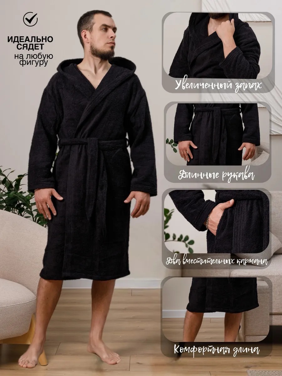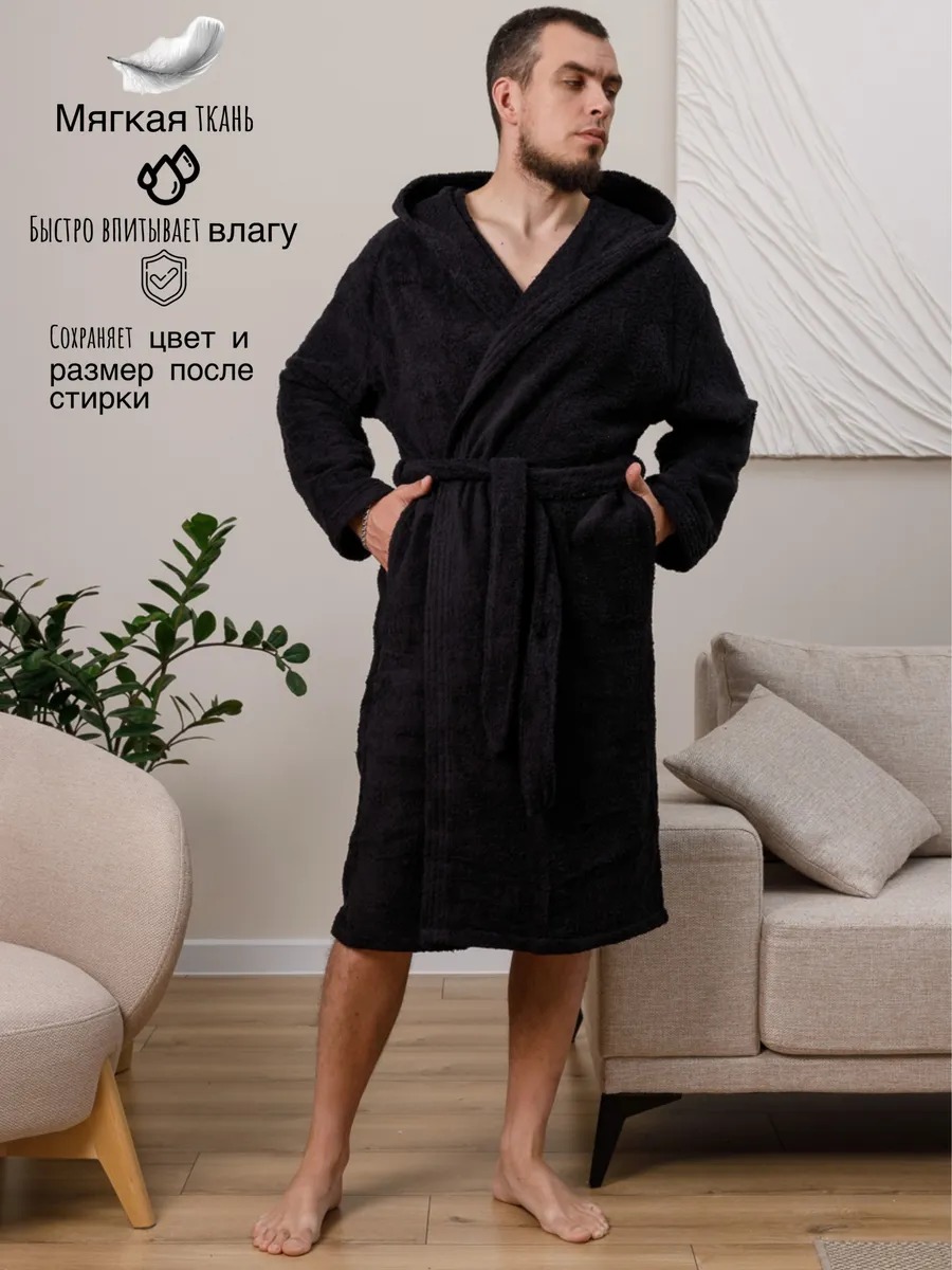 Халат махровый чёрный — это не просто предмет одежды, а настоящий оазис уюта и комфорта после насыщенного дня. Он словно обволакивает теплом и мягкостью, позволяя забыть о суете и расслабиться. Халат с капюшоном идеально подойдёт для домашнего отдыха: махровая ткань обеспечивает приятные тактильные ощущения и хорошо впитывает влагу, а капюшон добавит ощущение защищённости и уюта.