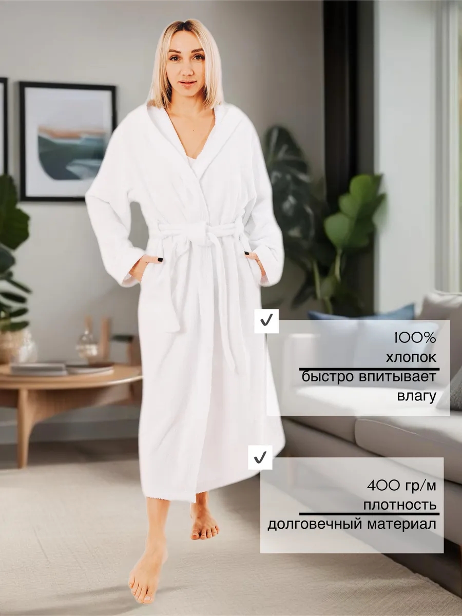 Махровая ткань обеспечивает приятные тактильные ощущения и хорошо впитывает влагу, что делает халат отличным вариантом для использования после душа или ванны. Белый цвет добавит свежести и чистоты в вашу домашнюю атмосферу, а также легко сочетается с любым интерьером.