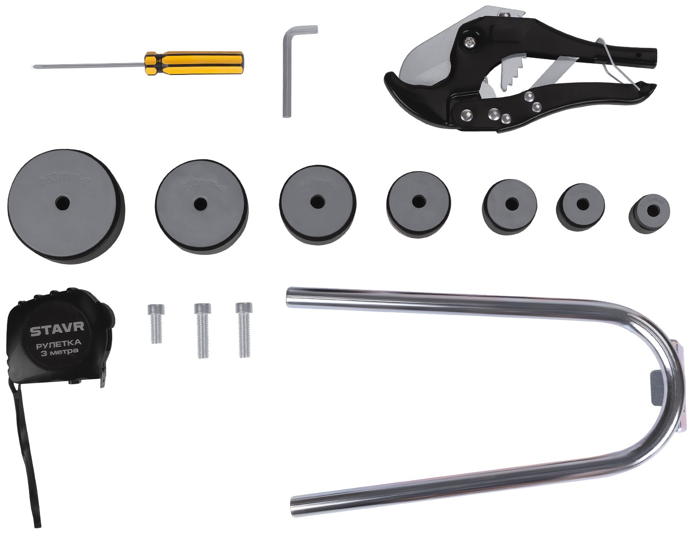 В комплект также входят ножницы для резки труб и рулетка — всё, что нужно для начала работы. А стальной кейс надёжно защитит аппарат при транспортировке и хранении — удобно брать с собой на объект.