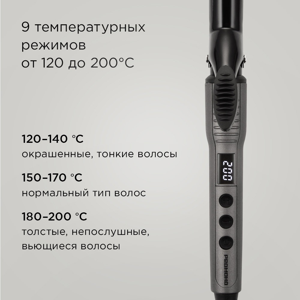 REDMOND HC1726 — ваш персональный стилист для создания безупречных причёсок. Эти элегантные щипцы в благородном сером цвете превратят ежедневную укладку в удовольствие. Благодаря керамическому покрытию и универсальному диаметру 25 мм они бережно завивают волосы, сохраняя их здоровье и естественный блеск. Девять температурных режимов от 120 до 200 градусов и функция быстрого нагрева позволяют подобрать оптимальные параметры для любого типа волос. Встроенный дисплей, индикаторы работы и вращающийся шнур длиной 1,8 метра делают процесс укладки максимально комфортным. Безопасность использования обеспечивают автоматическое отключение, защита от перегрева и термоизолированный наконечник. Щипцы REDMOND HC1726 — это профессиональный уход за волосами в домашних условиях, где инновационные технологии сочетаются с комфортом использования и превосходным результатом.