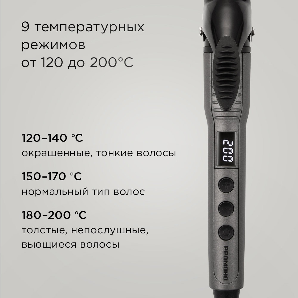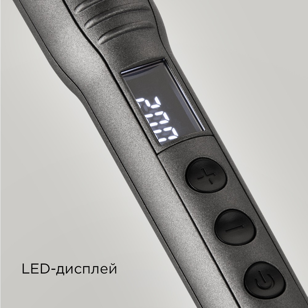 Современный дизайн с информативным дисплеем и вращающимся шнуром 1,8 м делает процесс укладки комфортным, а защита от перегрева и автоотключение через 60 минут гарантируют безопасность. Практичное кольцо для подвешивания обеспечивает удобное хранение прибора.