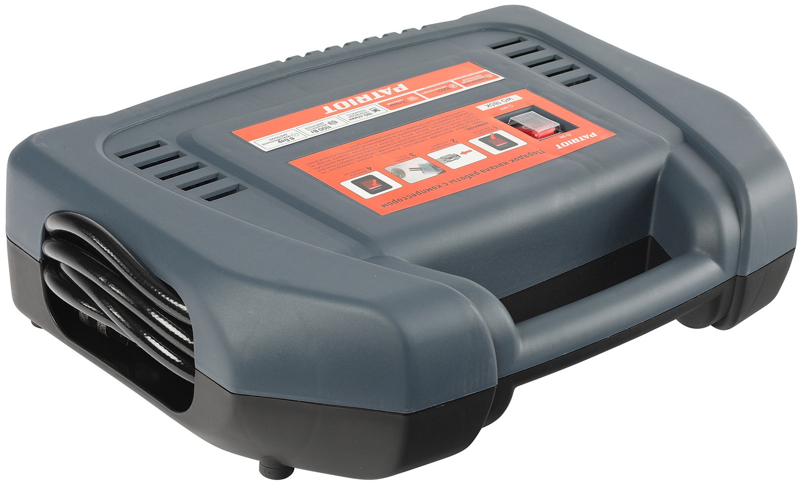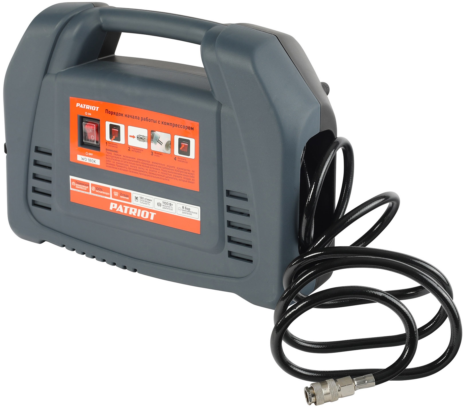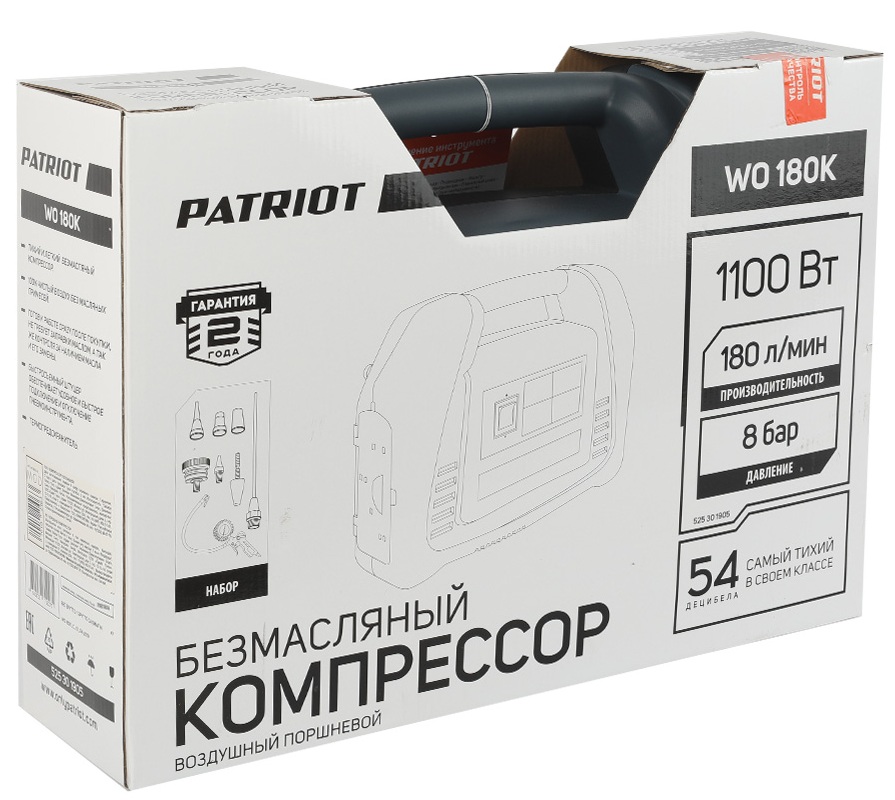 Компрессор Patriot WO 180K компактен и удобен в использовании: есть ручка для переноски, что позволяет легко перемещать устройство. В комплекте с компрессором вы получите документацию, комплект аксессуаров и пневмопистолет с манометром — всё, что нужно для начала работы.