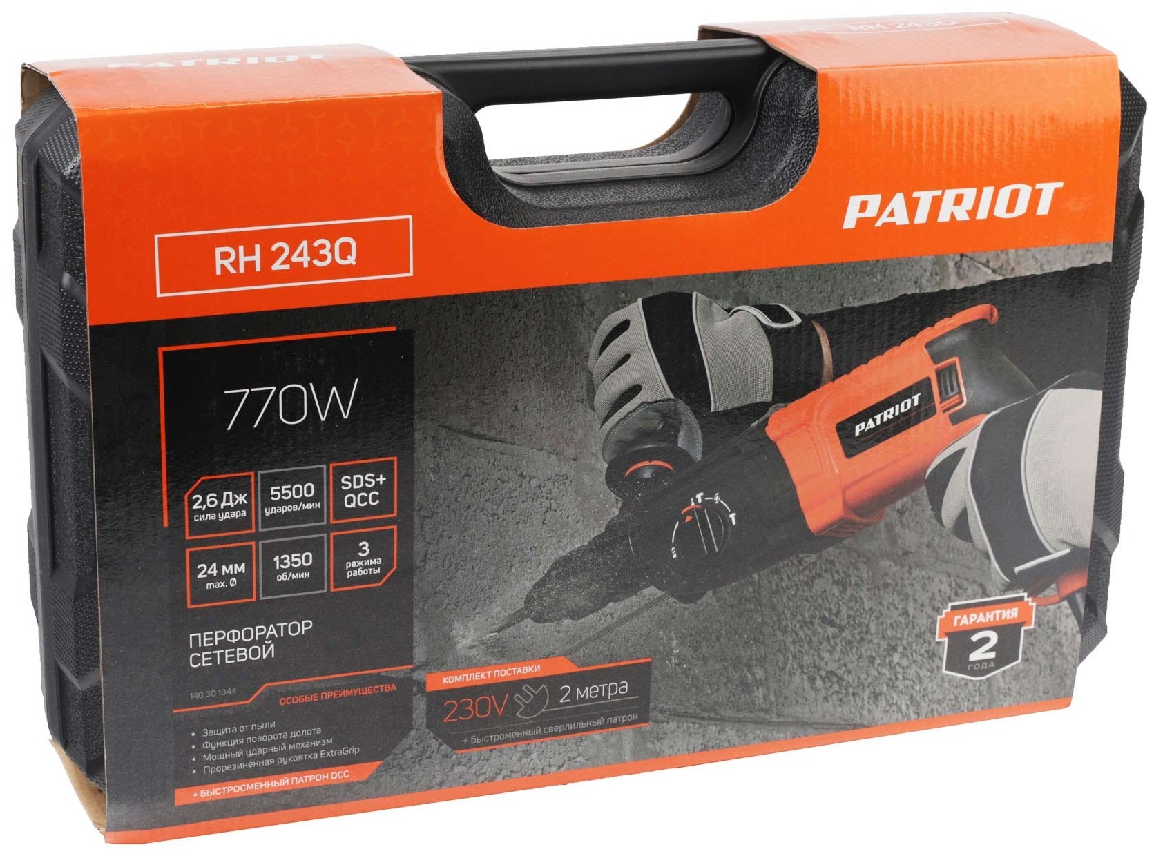Перфоратор Patriot RH 243Q — надёжный помощник в строительных и ремонтных работах! С мощностью в 770 Вт и скоростью вращения 1350 об/мин он легко справится с самыми твёрдыми материалами. Энергия удара в 2,6 Дж и частота ударов 5500 уд/мин позволяют быстро и эффективно выполнять работы.
