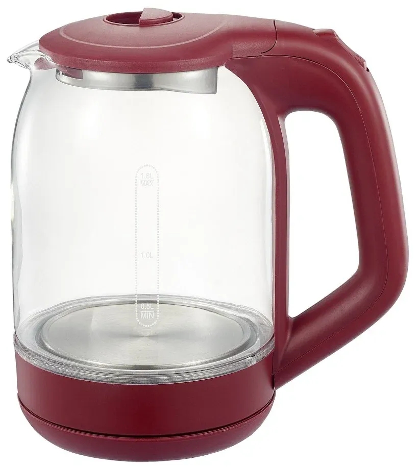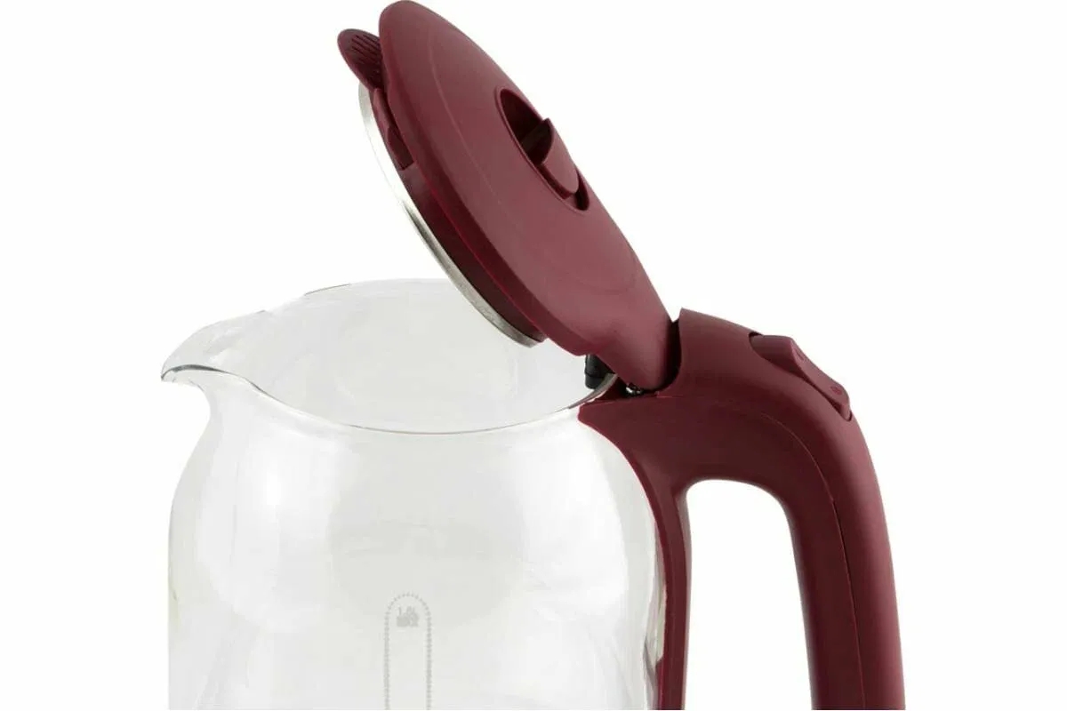 • Стильный дизайн. Вишнёвый цвет и сочетание пластика и стекла придают чайнику элегантность и делают его украшением любой кухни.