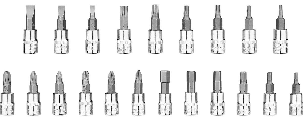 С помощью этого набора вы сможете справиться с самыми разными задачами: от монтажа и ремонта до сборки мебели. В наборе есть всё необходимое для работы с различными видами крепежа: биты SL, PH, PZ, T, H разных размеров, а также торцевые головки от 4 мм до 14 мм.
