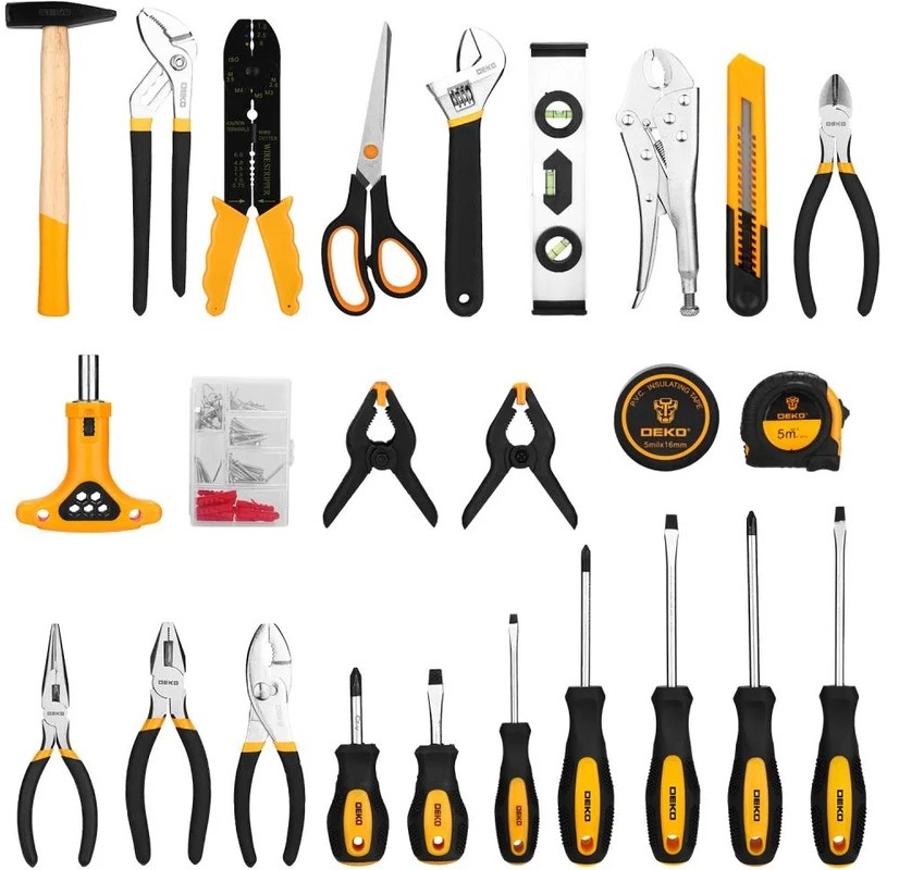 Дополнительные инструменты, такие как зажимные клещи, уровень, изоляционная лента, ножницы, инструмент для зачистки проводов и строительный нож, делают набор удобным в использовании для различных видов работ. А наличие набора метизов по дереву расширяет возможности использования набора.