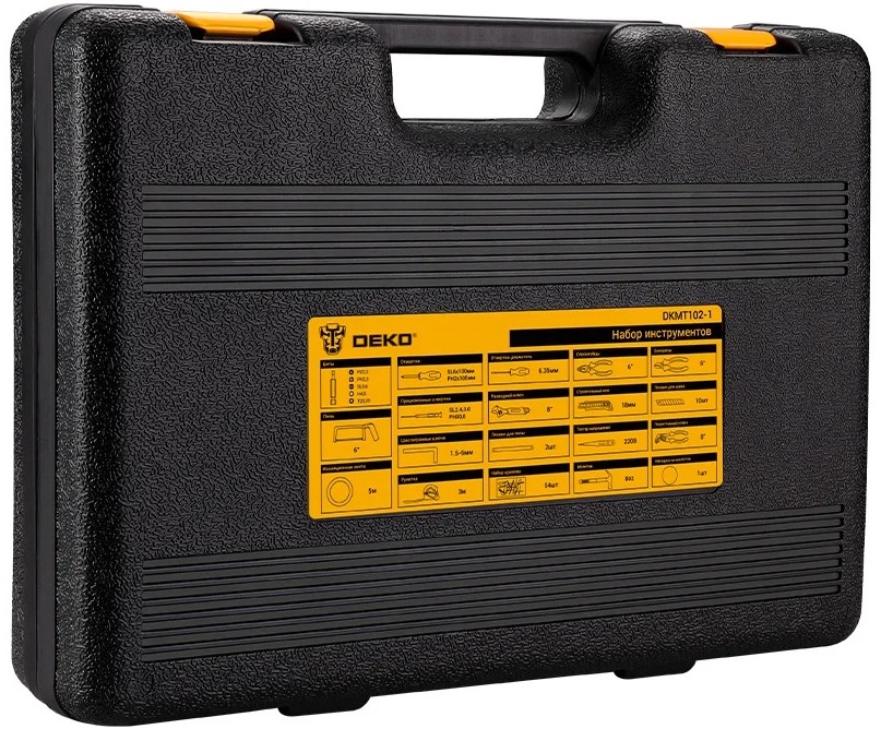 Все инструменты упакованы в удобный кейс, что обеспечивает их безопасное хранение и транспортировку. DEKO DKMT 102-1 — это надёжный и универсальный набор инструментов, который станет незаменимым помощником в любом доме или гараже.