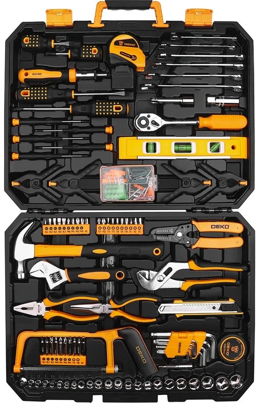 С этим набором в вашем распоряжении окажутся все необходимые инструменты: отвёртки, ключи, головки, биты, пассатижи, длинногубцы, молоток, пила и многое другое. Среди предметов вы найдёте как базовые, так и более специализированные инструменты, например, инструмент для зачистки проводов или нейлоновый зажим.