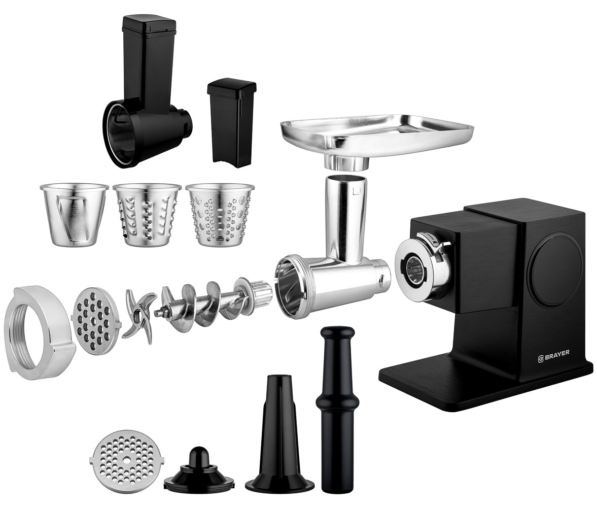 Мясорубка BRAYER BR1611 черного цвета оснащена мощным двигателем 2500 Вт, обеспечивающим производительность 2,5 кг фарша в минуту. Модель оборудована современным сенсорным управлением с LCD-дисплеем и функцией реверса. В комплект входят 7 разнообразных насадок: для приготовления драников, фарша, терки, шинковки, колбас и кеббе, а также два диска из нержавеющей стали с отверстиями 5 и 8 мм. Устройство оснащено металлическим лотком, толкателем для продуктов и прорезиненными противоскользящими ножками для устойчивости. Мясорубка защищена от перегрева и имеет уровень шума 75 дБ. Важно учитывать, что насадки и ножи рекомендуется мыть вручную, не используя посудомоечную машину.