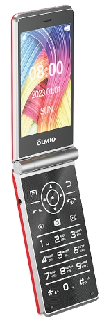 Мобильный телефон‑раскладушка Olmio F50 в красном цвете оснащён тонким металлическим корпусом, двумя слотами для SIM‑карт и слотом для карт памяти microSD/SDHC, что позволяет использовать связь двух операторов и расширять объём памяти. На крышке расположен второй дисплей с индикаторами, благодаря которым можно узнать время, уровень заряда батареи, а также увидеть пропущенные вызовы или SMS, не открывая телефон. Устройство имеет большой дисплей диагональю 3,5 дюйма с разрешением 320×480 px, встроенную фото‑ и видеокамеру на 0,3 Мп, Bluetooth, виброзвонок, двойной фонарик и FM‑радио. Ёмкость аккумулятора составляет 1400 мА·ч, при этом пыле‑ и влагозащиты нет.