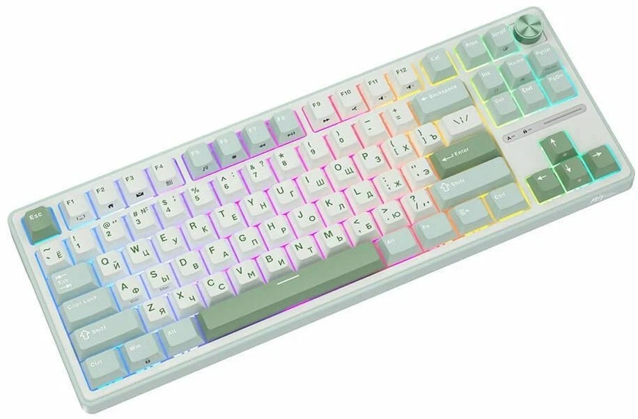 Познакомьтесь с клавиатурой Royal Kludge RK R87 Pro Sky Cyan — настоящим произведением искусства для ценителей качественных игровых аксессуаров. Эта механическая клавиатура не только порадует вас своим стильным дизайном в бело-зелёной цветовой гамме, но и обеспечит непревзойдённый комфорт во время игры или работы.