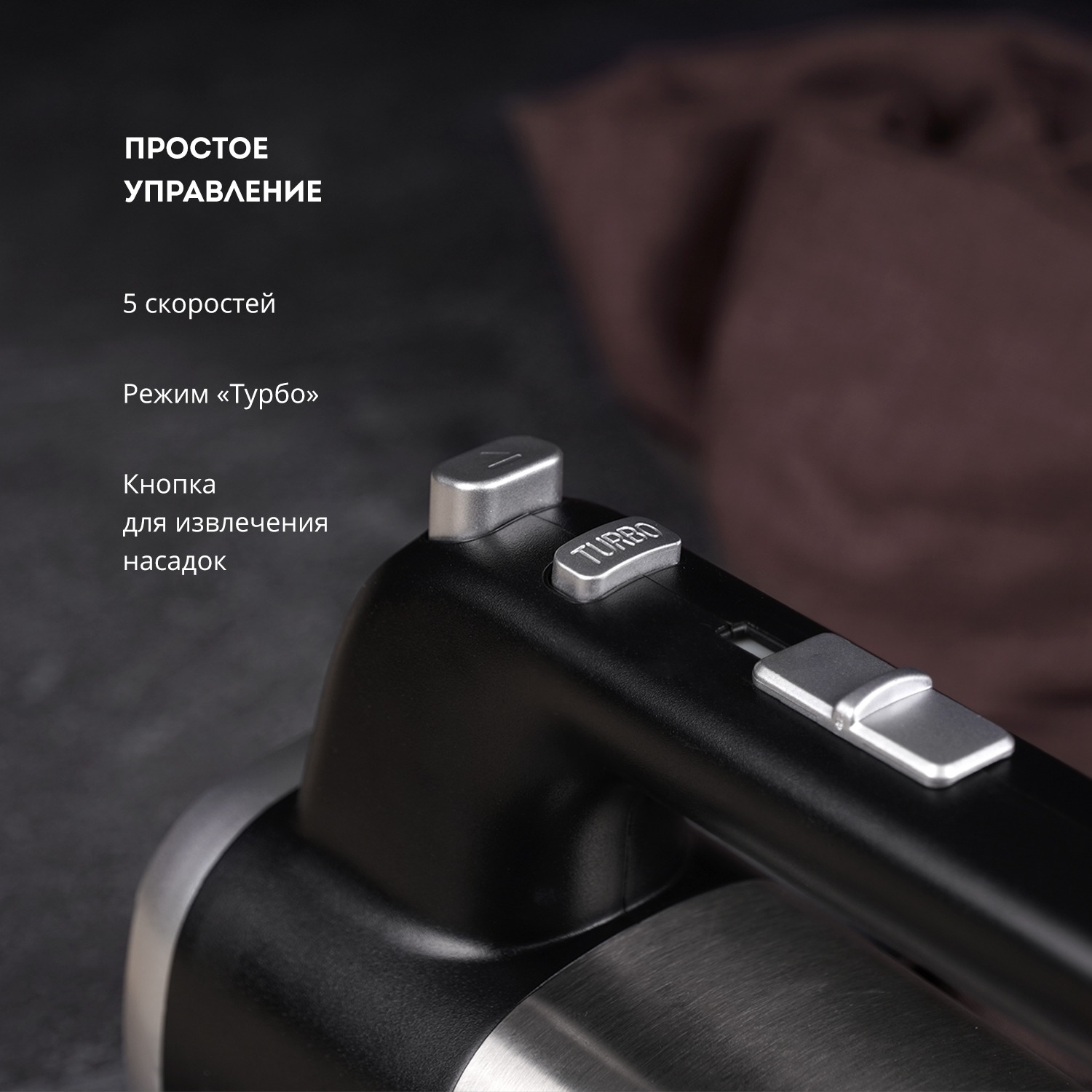 Удобство использования миксера подчёркивает наличие индикатора работы и кнопки для извлечения насадок. Длина шнура питания составляет 1 метр — это достаточно для комфортного размещения прибора на кухне.