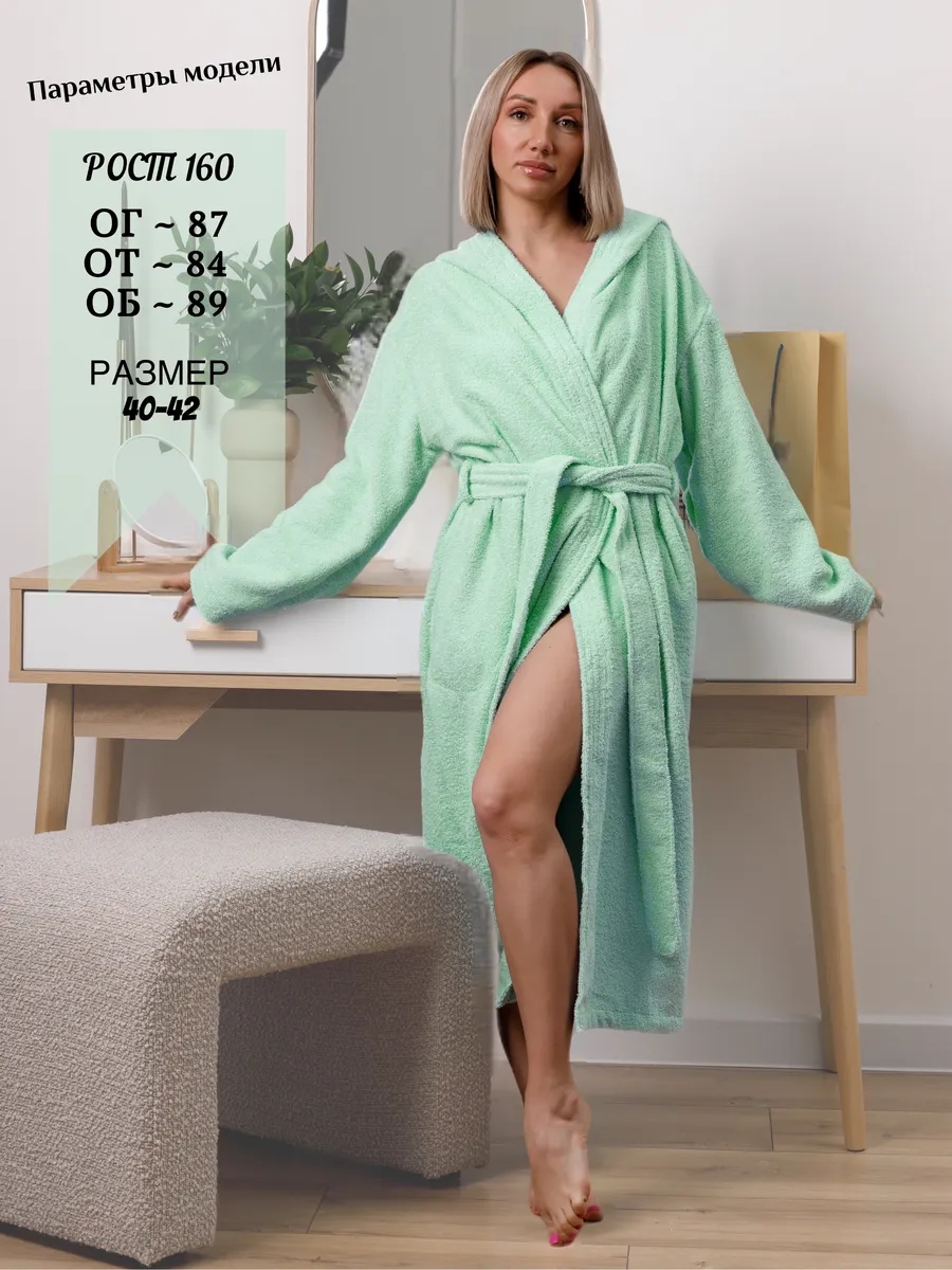 Особенностью халата является наличие капюшона — он добавит практичности и позволит почувствовать себя ещё более расслабленно. Светло-зелёный цвет создаст атмосферу спокойствия и гармонии, поможет снять напряжение и настроиться на отдых.