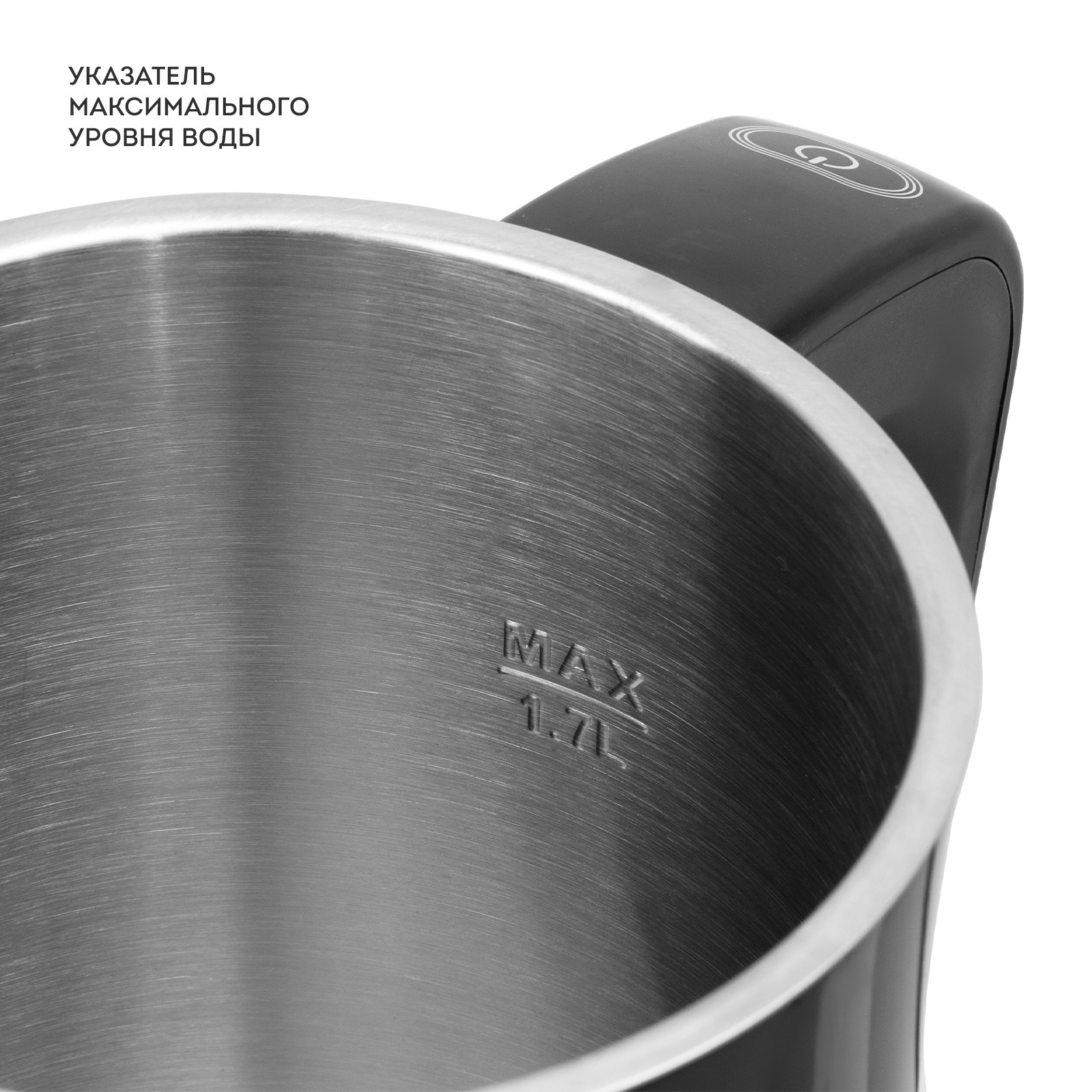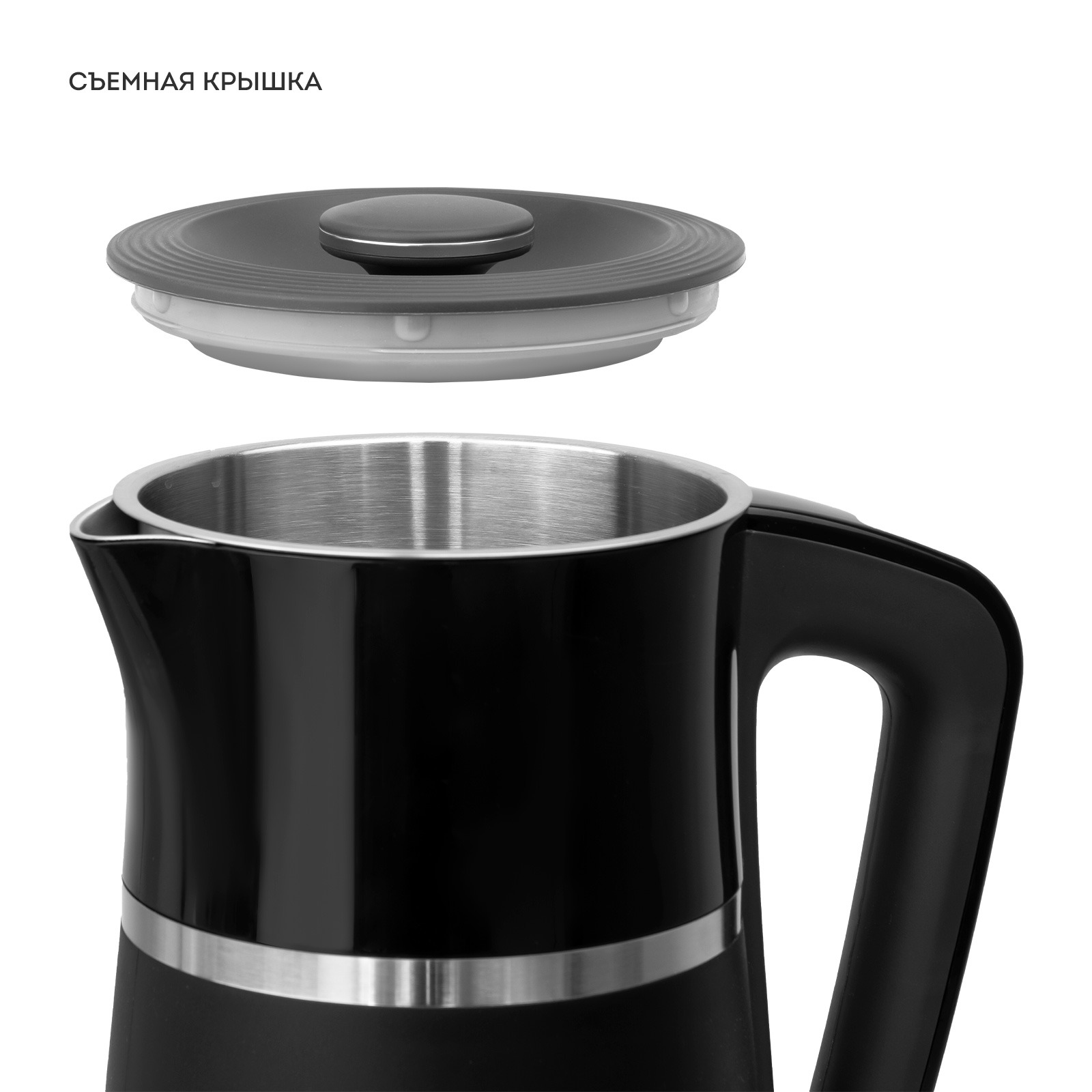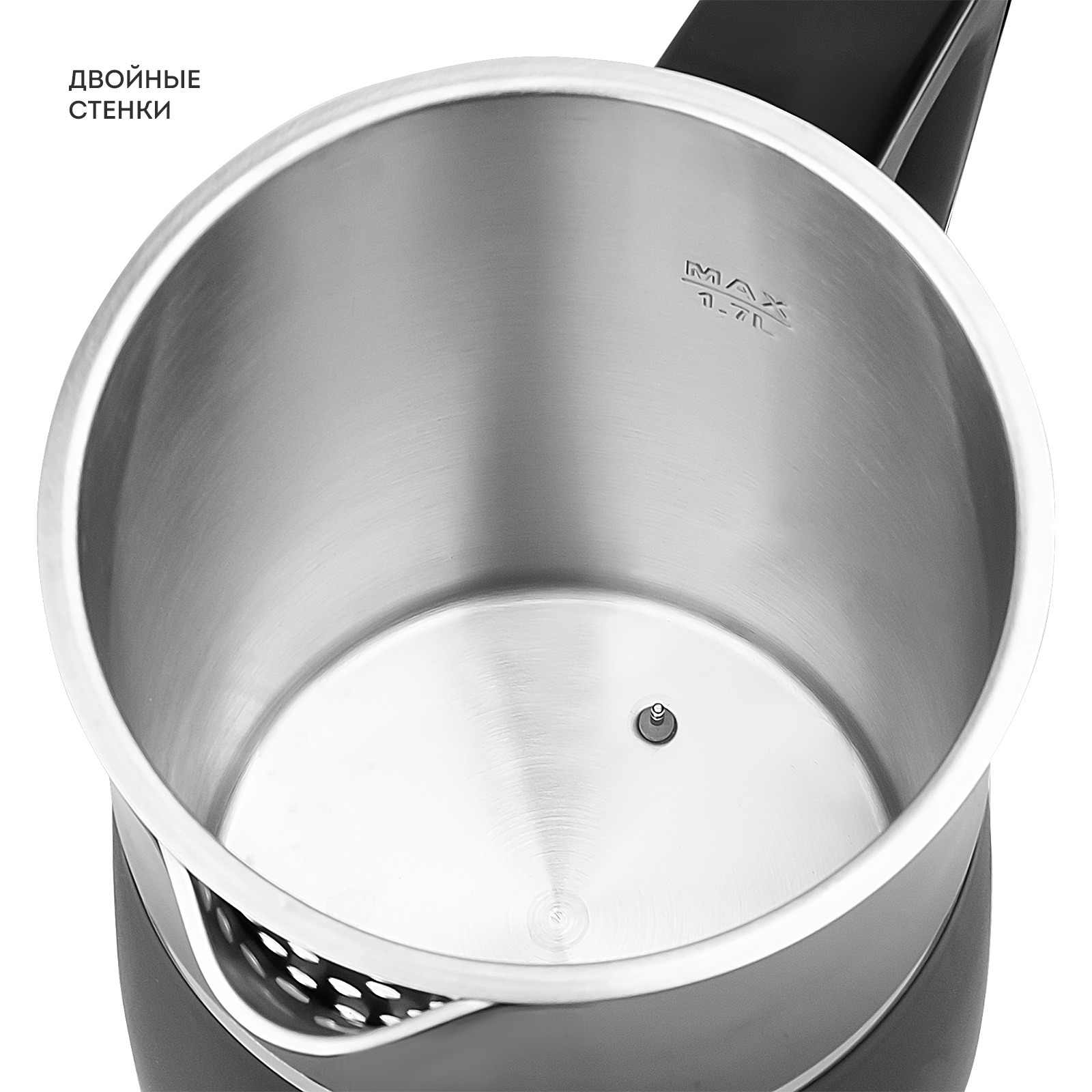 Объём в 1,7 литра подойдёт для семьи или небольшого коллектива — чайник сможет удовлетворить потребности нескольких человек одновременно. Двойные стенки из нержавеющей стали 18/10 и пищевого пластика обеспечивают долговечность и надёжность прибора, а также помогают сохранять температуру воды на более длительное время.