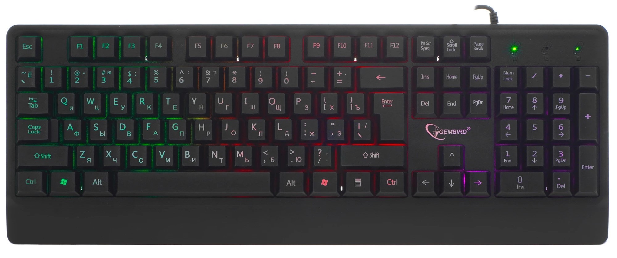 • Стильный внешний вид. Чёрный цвет и многоцветная (Rainbow) подсветка клавиш создадут неповторимую атмосферу во время работы или игр. Подсветка охватывает английскую и русскую раскладки, а также область кейкапов, что делает клавиатуру не только удобной, но и визуально привлекательной.