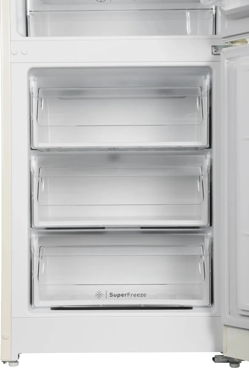 Общий объем устройства составляет 298 литров, что позволяет вместить большие объемы продуктов питания. Внутри холодильника удобно организовано пространство с несколькими стеклянными полками и прозрачными ящиками, что позволяет эффективно использовать доступное место.