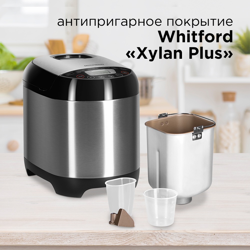 Антипригарное покрытие чаши Whitford «Xylan Plus» гарантирует, что хлеб не прилипнет, а уход за хлебопечью будет лёгким и быстрым. Смотровое окно позволит следить за процессом выпечки, не открывая крышку, а энергонезависимая память (40 минут) сохранит настройки в случае временного отключения электричества.