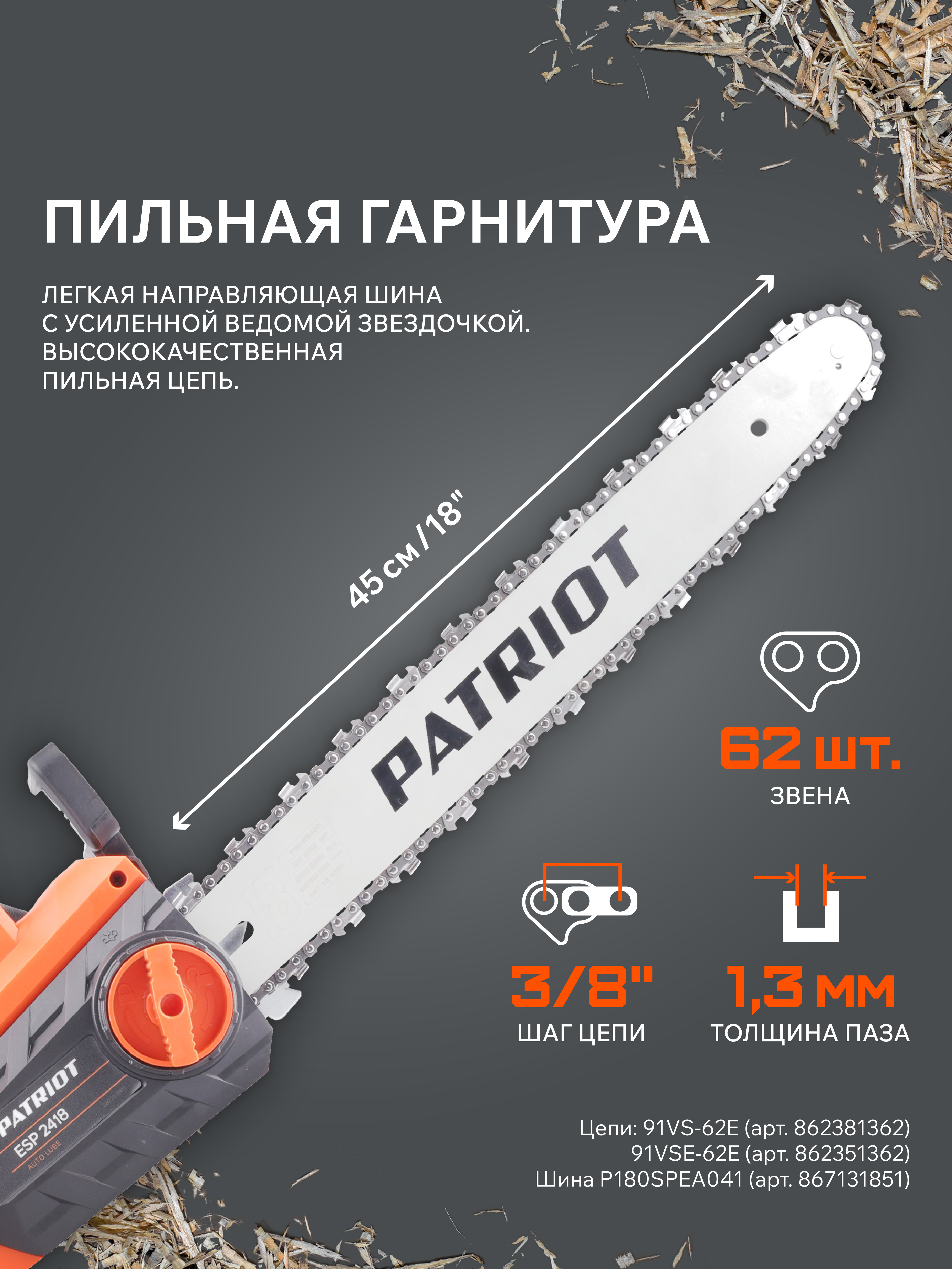 Цепная электрическая пила Patriot ESP 2418 — надёжный помощник в работе с деревом! Этот инструмент станет незаменимым атрибутом как для профессиональных строителей, так и для любителей благоустраивать свой участок.